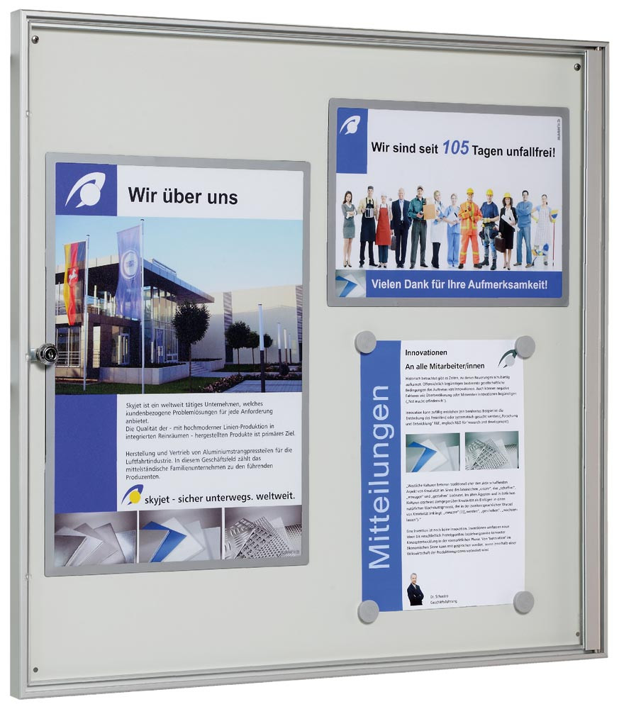 · Aus Aluminium-Profilen · Bautiefe 27 mm · Rückwand magnethaftend, Farbe grauweiß · Frontscheibe aus Einscheiben-Sicherheitsglas (ESG) · Öffnung mit Drehflügel seitlich nach rechts · Abschließbar · Entsprechen den Brandschutzbestimmungen B1 · Lieferung ohne Schriftleiste