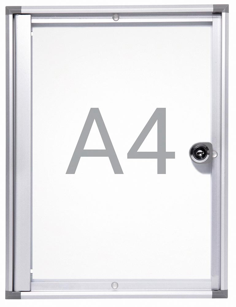 · Einseitiger Schaukasten zur Wandmontage · Bautiefe 31 mm · Innentiefe 9 mm · Rahmen aus silbereloxiertem Aluminiumprofil · Abgeschrägte Eckverbindungen aus Kunststoff · Rahmenlose Flügeltür aus Kunststoffglas mit integriertem Schloss, ab Format 9 x A4 mit 2 Schlössern · Abschließbar, inkl. 2 Schlüsseln · Rückwand aus grau beschichtetem Stahlblech · Magnethaftend · Beschrift- und trocken abwischbar
