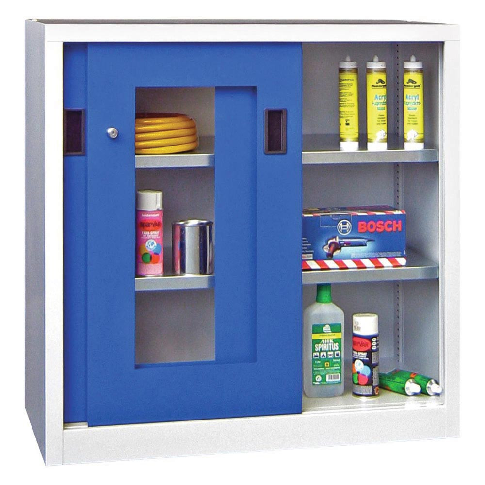 Schiebetürenschrank, Sichtfenstertüren, 2 verzinkte Böden, ohne Trennwand, BxTxH 1000x500x1000 mm, RAL 5010 E875309