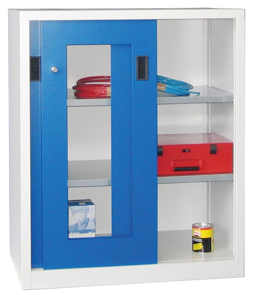 Schiebetürenschrank, Sichtfenstertüren, 2 verzinkte Böden, ohne Trennwand, BxTxH 1000x500x1200 mm, RAL 7035/5010