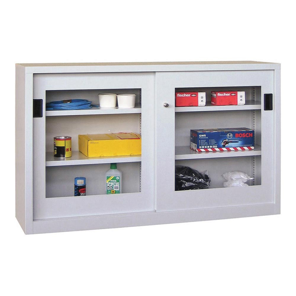 ∙ Korpus aus geschweißtem Stahlblech mit hochwertiger Pulverbeschichtung ∙ Türen mit Sichtfenster aus bruchsicherem Acrylglas (Schlagzähigkeit 15 kJ/m2), auf Spezialrollen im oberen Führungsprofil sicher geführt und mit Quetschschutz, auf Puffer aufschlagend ∙ Gemeinsam durch Drehdruckzylinder verschließbar, inkl. 2 Schlüsseln ∙ Serienmäßig verzinkte Fachböden, im Raster von 17 mm höhenverstellbar und mit 80 kg belastbar ∙ Gesamt-Belastbarkeit: Schränke ohne Trennwand 500 kg, mit Trennwand 600 kg (Traglastangaben verstehen sich bei gleichmäßig verteilter Last)