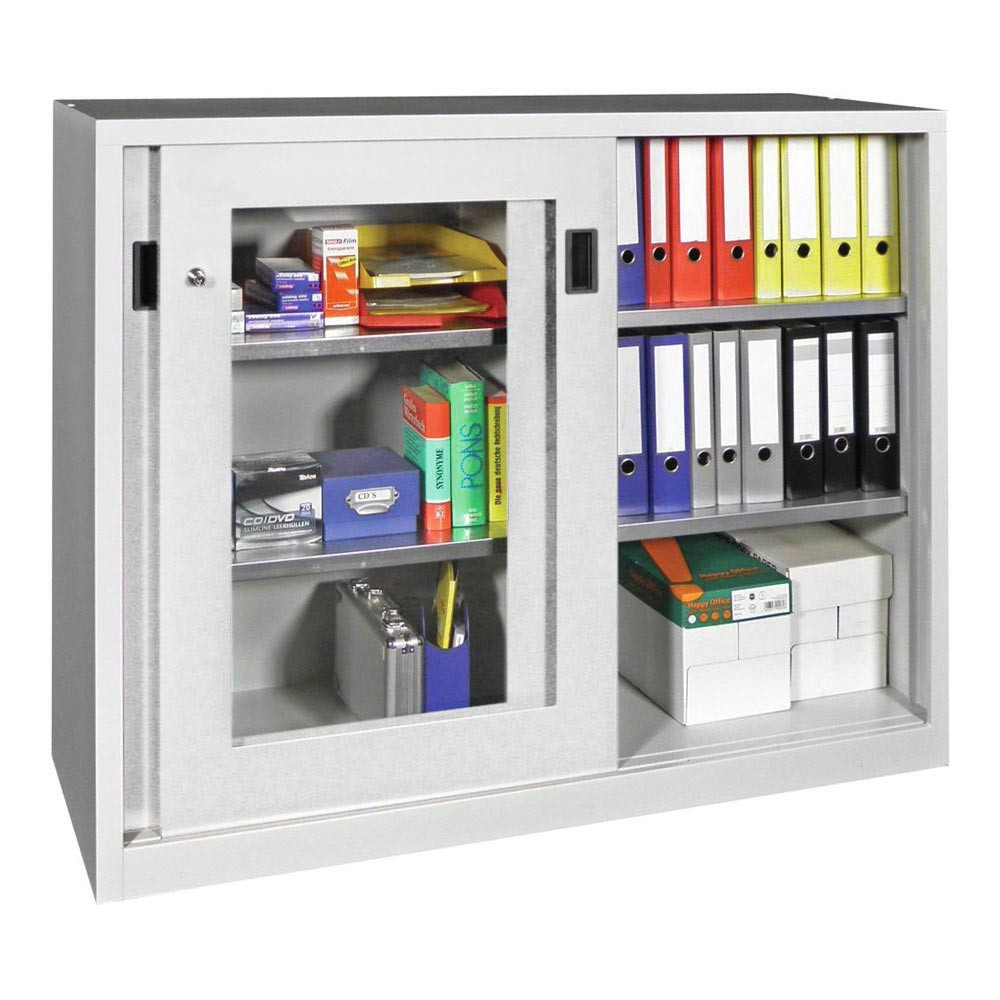 Schiebetürenschrank, Sichtfenstertüren, 4 verzinkte Böden, mit Trennwand, BxTxH 1500x600x1200 mm, RAL 7035