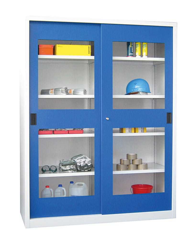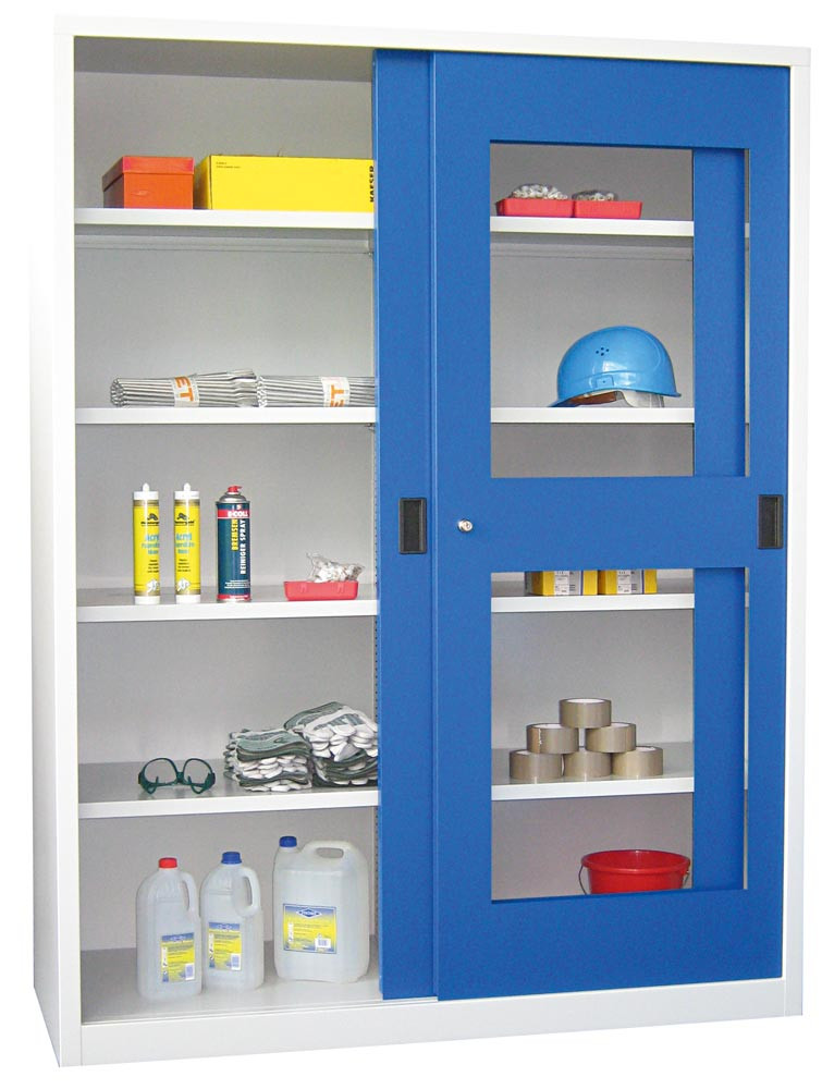 ∙ Korpus aus geschweißtem Stahlblech mit hochwertiger Pulverbeschichtung ∙ Türen mit Sichtfenster aus bruchsicherem Acrylglas (Schlagzähigkeit 15 kJ/m2), auf Spezialrollen im oberen Führungsprofil sicher geführt und mit Quetschschutz, auf Puffer aufschlagend ∙ Gemeinsam durch Drehdruckzylinder verschließbar, inkl. 2 Schlüsseln ∙ Serienmäßig verzinkte Fachböden, im Raster von 17 mm höhenverstellbar und mit 80 kg belastbar ∙ Gesamt-Belastbarkeit: Schränke ohne Trennwand 500 kg, mit Trennwand 600 kg (Traglastangaben verstehen sich bei gleichmäßig verteilter Last)