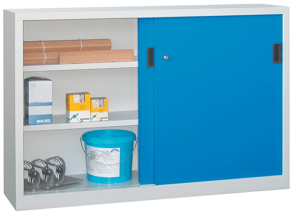 Schiebetürenschrank, Vollblechtüren, 2 verzinkte Böden, ohne Trennwand, BxTxH 1000x400x1000 mm, RAL 7035/5010