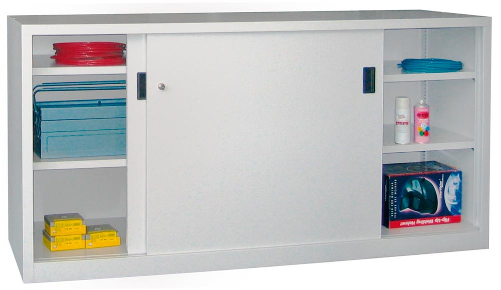 Schiebetürenschrank, Vollblechtüren, 2 verzinkte Böden, ohne Trennwand, BxTxH 1000x400x1000 mm, RAL 7035/3000 E875737