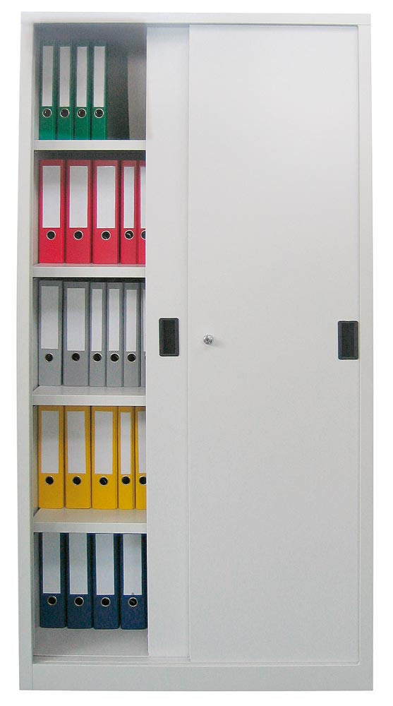 Schiebetürenschrank, Vollblechtüren, 4 verzinkte Böden, ohne Trennwand, BxTxH 1000x400x1950 mm, RAL 7035 E875880