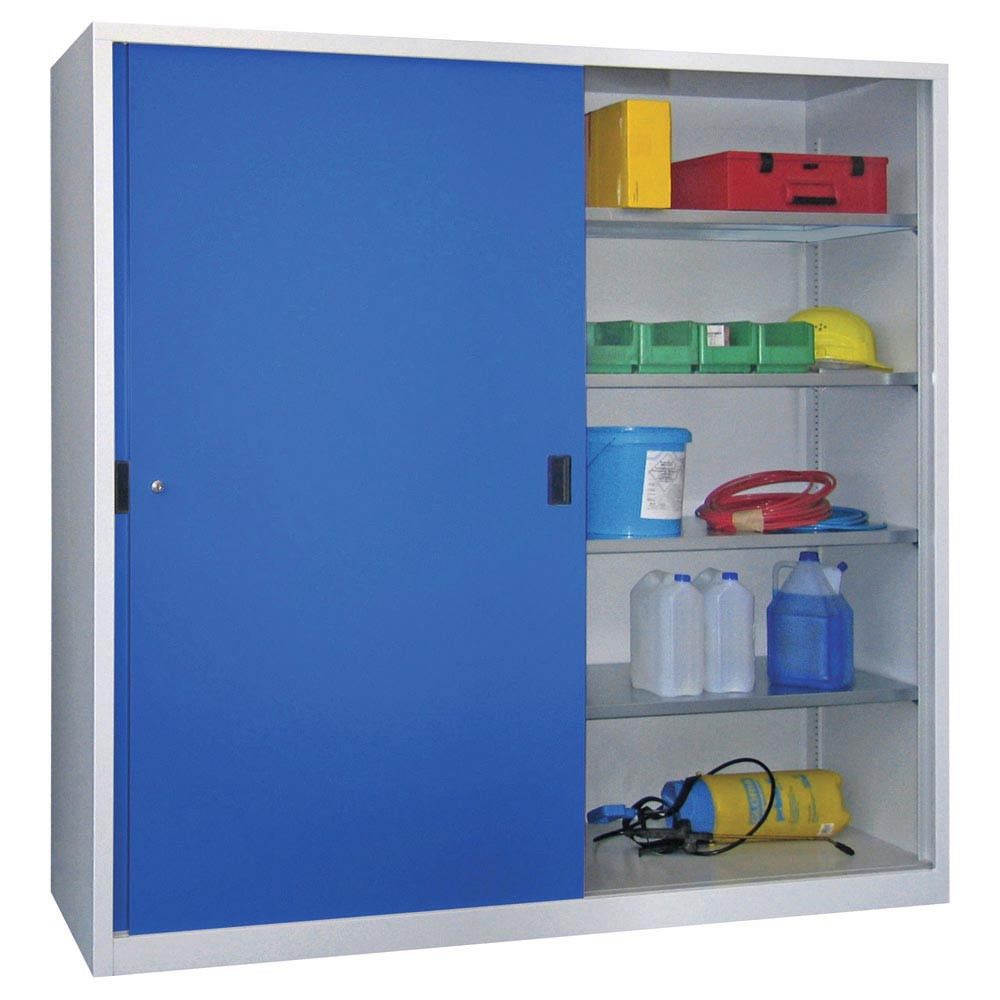 Schiebetürenschrank, Vollblechtüren, 4 verzinkte Böden, ohne Trennwand, BxTxH 1000x400x1950 mm, RAL 7035/5010 E875882