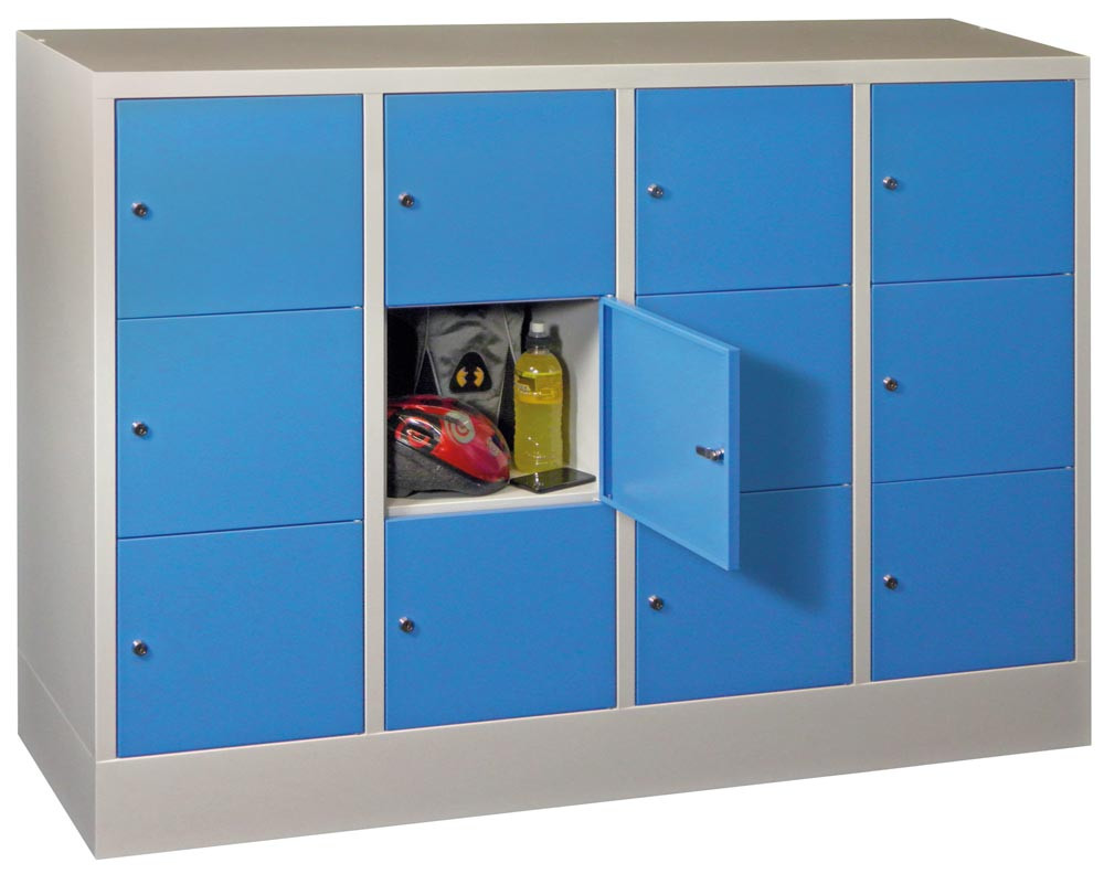 Schließfachschrank Kindergarten/Schule, Sockel, 12 Fächer 400 mm, BxTxH 1600x500x1187 mm, Zylinderschloss RAL 7035/5010