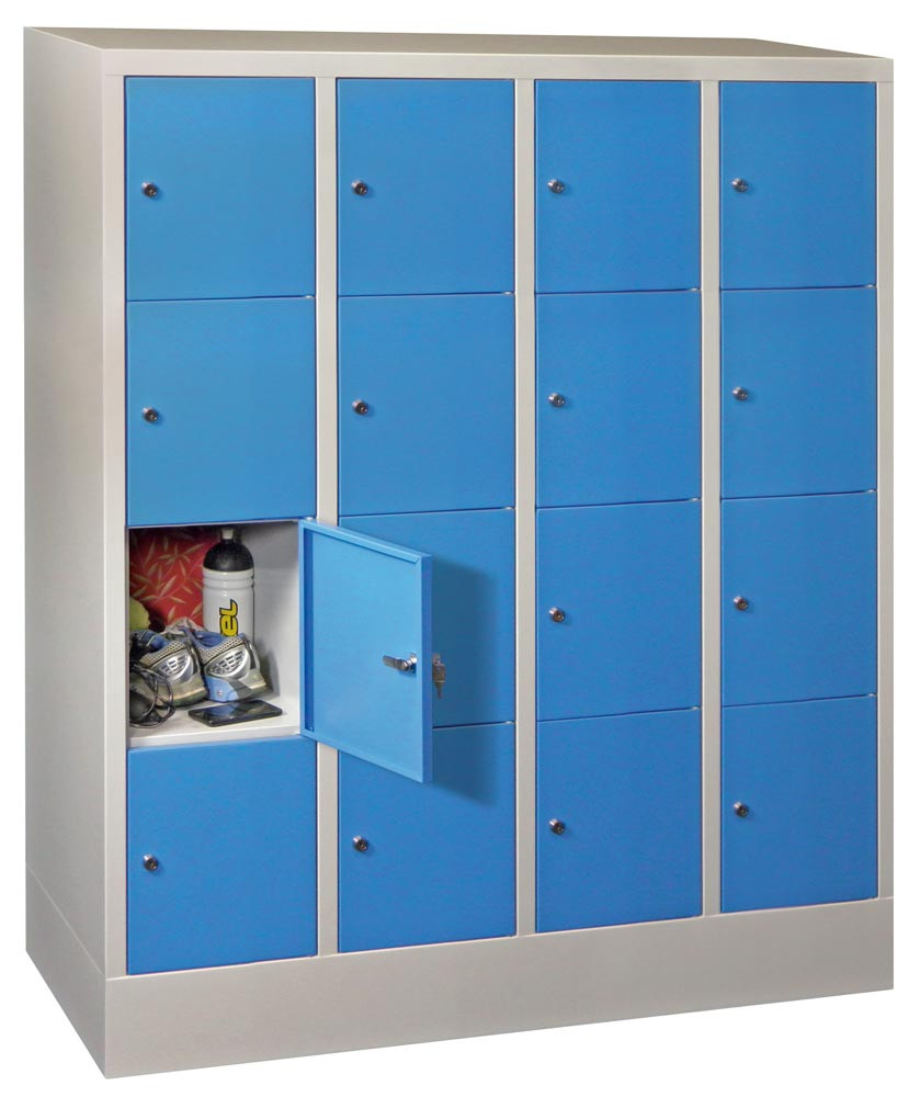 Schließfachschrank Kindergarten/Schule, Sockel, 16 Fächer 400 mm, BxTxH 1600x500x1518 mm, Zylinderschloss RAL 7035/5010