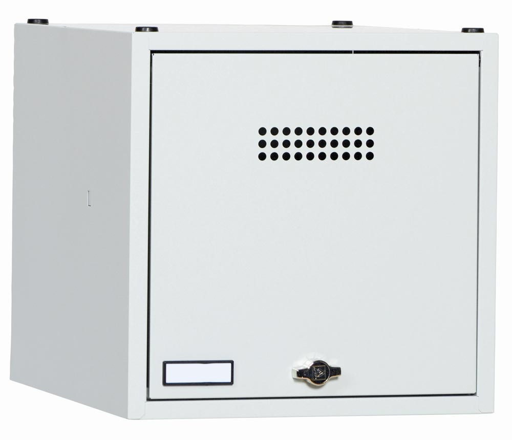 Schließfachwürfel, BxTxH 500x500x500 mm, Tür glatt, Lochrosetten und Etikettenrahmen, Fachboden, Drehriegel, RAL 7035 E861364