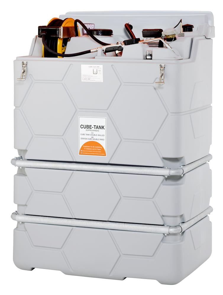 ∙ Mit integrierter Auffangwanne ∙ Optische Leckageanzeige ∙ Befüllanschluss mit TW-Kupplung ∙ Überfüllsicherung ∙ Entlüftungsklappe ∙ Füllstandsanzeiger ∙ Elektrische Pumpe 230 V, 9 l/min, 12 bar ∙ Zapfpistolenhalter