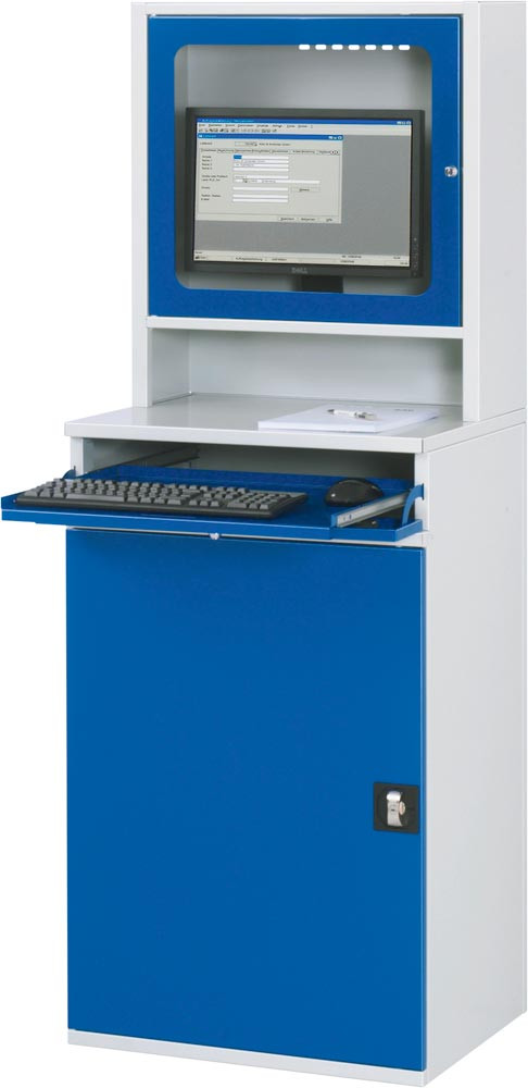 · Zur optimalen Unterbringung von Dokumenten, Computern und Peripheriegeräten · Stabile, verwindungssteife Stahlblechkonstruktion · Unterbaugehäuse, geteilt in Tastatur- und Flügeltürfach, getrennt von einander verschließbar · Tastaturfach mit Klappe: Fachhöhe 120 mm, dahinter ein Auszugtablar zur Auflage der Tastatur sowie der Maus · Flügeltürfach: Fachhöhe 850 mm, Türöffnungswinkel ca 225°, Nutztiefe 500 mm · Diverse Kabeldurchführungen an der Gehäuserückseite, im Deckel und im Innenteil · Lackierung: Gehäuse RAL 7035 lichtgrau, Front RAL 5010 enzianblau · Lieferung komplett montiert