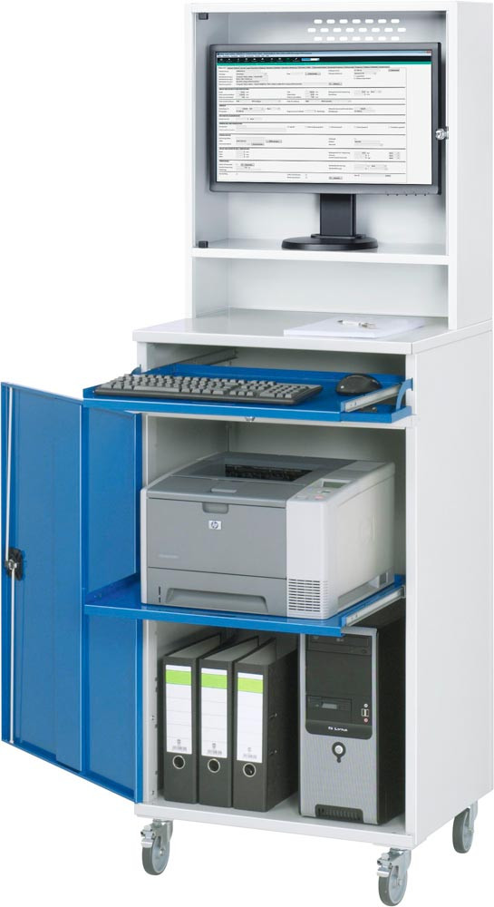 · Zur optimalen Unterbringung von Dokumenten, Computern und Peripheriegeräten · Stabile, verwindungssteife Stahlblechkonstruktion · Unterbaugehäuse, geteilt in Tastatur- und Flügeltürfach, getrennt von einander verschließbar · Tastaturfach mit Klappe: Fachhöhe 120 mm, dahinter ein Auszugtablar zur Auflage der Tastatur sowie der Maus · Flügeltürfach: Fachhöhe 850 mm, Türöffnungswinkel ca 225°, Nutztiefe 500 mm · Diverse Kabeldurchführungen an der Gehäuserückseite, im Deckel und im Innenteil · Lackierung: Gehäuse RAL 7035 lichtgrau, Front RAL 5010 enzianblau · Lieferung komplett montiert