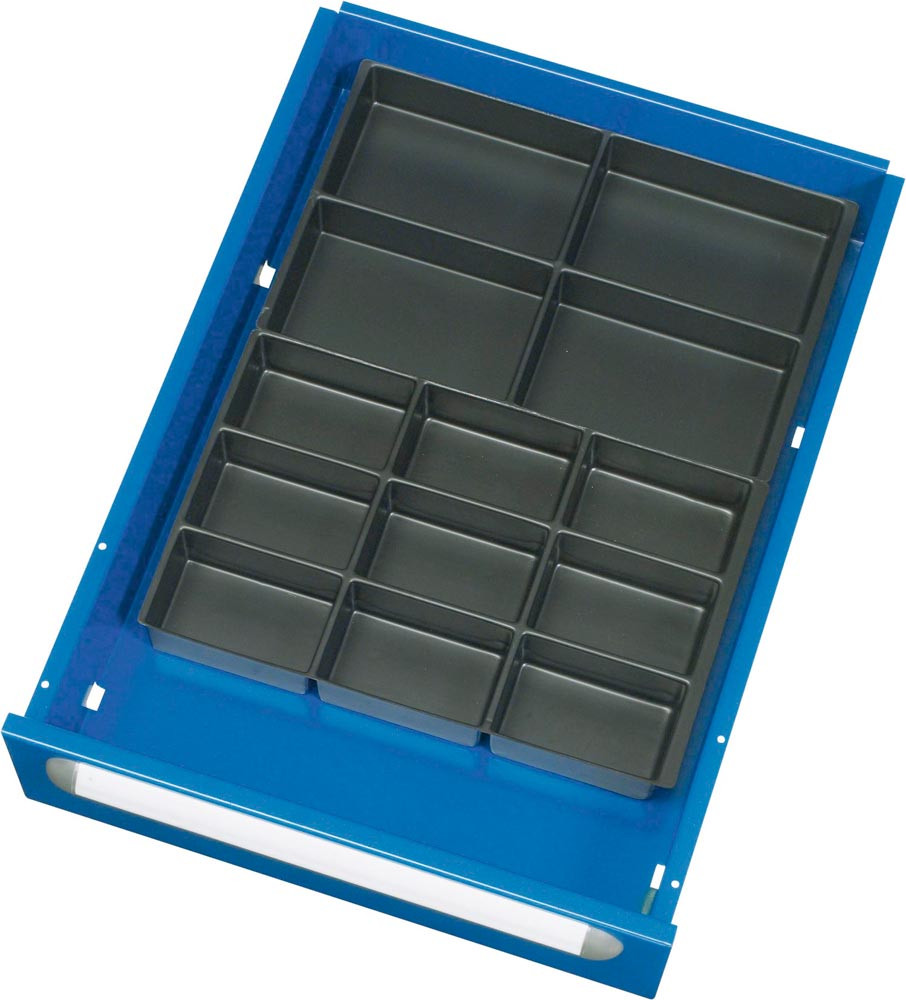 Schubladen-Einteilungs-Set, Fronthöhe 60 - 90 und 120 bis 360 mm, B x T 365 x 460 mm, 1 Einsatz mit 4 Fächern, 1 Einsatz mit 9 Fächern