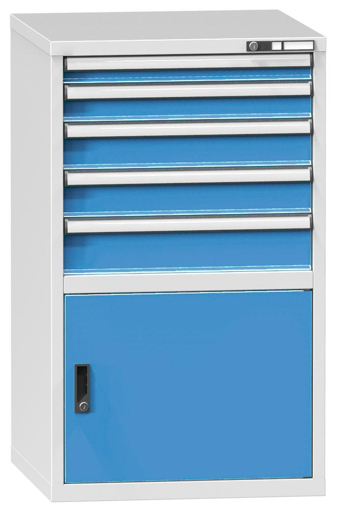 Schubladenschrank, 5 Schubladen: 1x75, 1x100, 2x125, 1x150, 1 Tür 550 mm, BxTxH 731x753x1215 mm, RAL 7035/5012