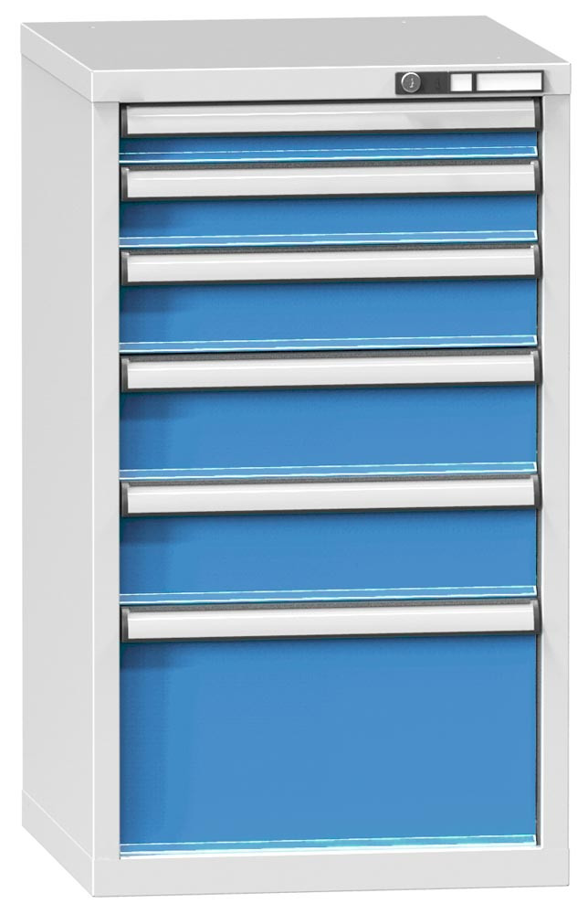 Schubladenschrank, 6 Schubladen: 1x75, 1x100, 1x125, 2x150, 1x300 mm, BxTxH 578x600x990 mm, RAL 7035/5012