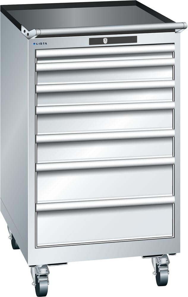 Schubladenschrank, Traglast/Schubl.: 75 kg, fahrbar, 7 Schubl.: 50, 2x75, 2x100,2x150 mm, RFID-Schloss, BxTxH 564x725x990 mm, RAL 7035 E6409519
