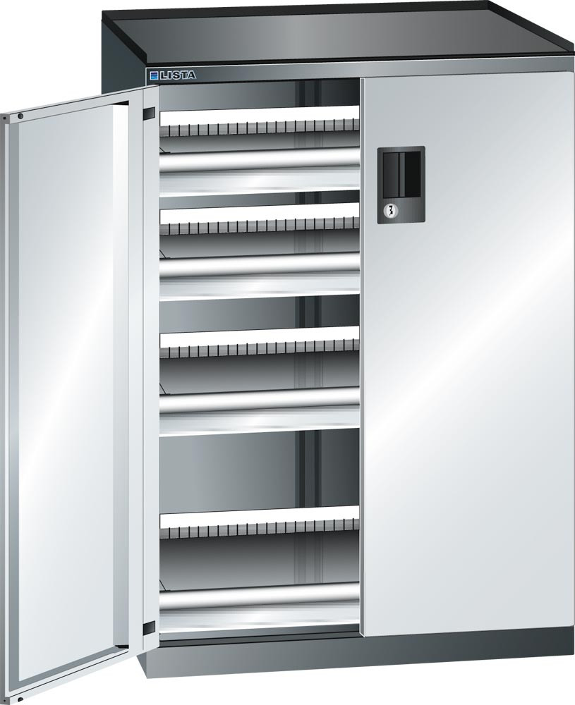 Schubladenschrank m. Flügeltüren, BxTxH 717x600x1020 mm, 4x75 Schubladen 200 kg, Schloss, RAL 7035 E1986716