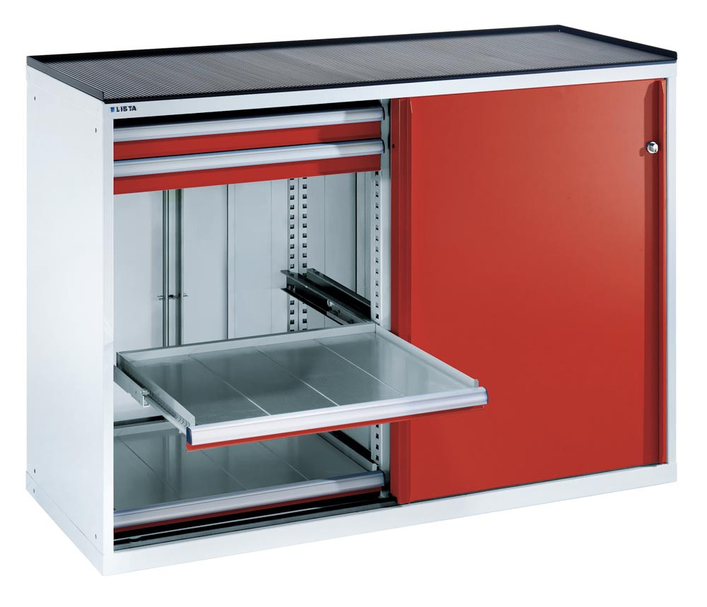 ∙ Aus hochwertigem, pulverbeschichtetem Stahlblech ∙ Optimal bei engen Raumverhältnissen ∙ Schiebetüren mit einer hohen Laufruhe ∙ Inneneinrichtung im 25 mm Raster in der Höhe verstellbar ∙ Mit Zylinderschloss ∙ Abrollrand 3-seitig inkl. Rillenmatte