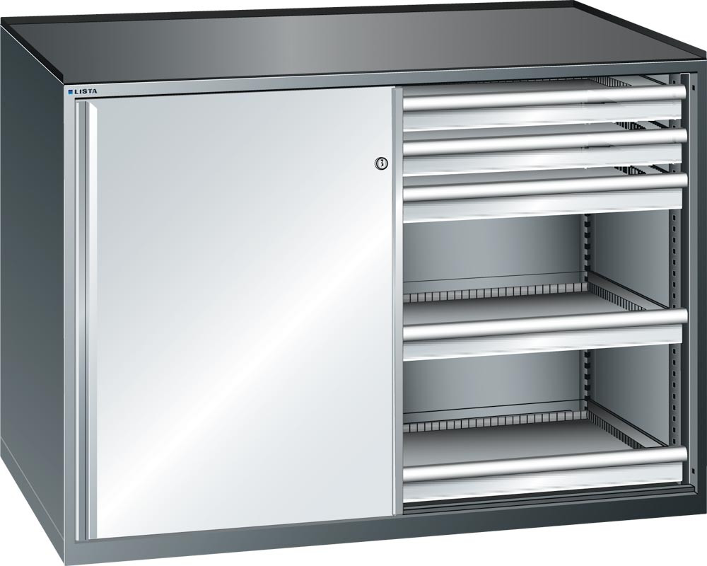 Schubladenschrank m. Schiebetüren, BxTxH 1430x627x1020 mm, 10 Schubladen 75 mm 200 kg, Schloss, RAL 7035 E1986786