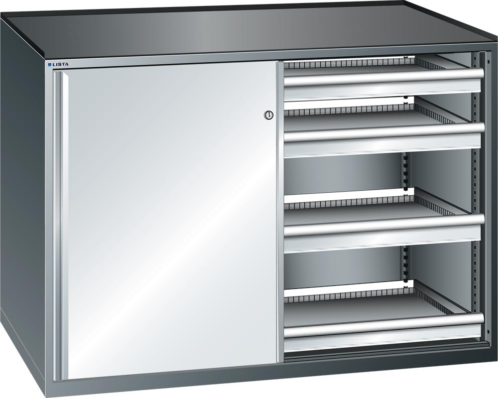 Schubladenschrank m. Schiebetüren, BxTxH 1430x627x1020 mm, 8 Schubladen 75 mm 200 kg, Schloss, RAL 7035 E1986778