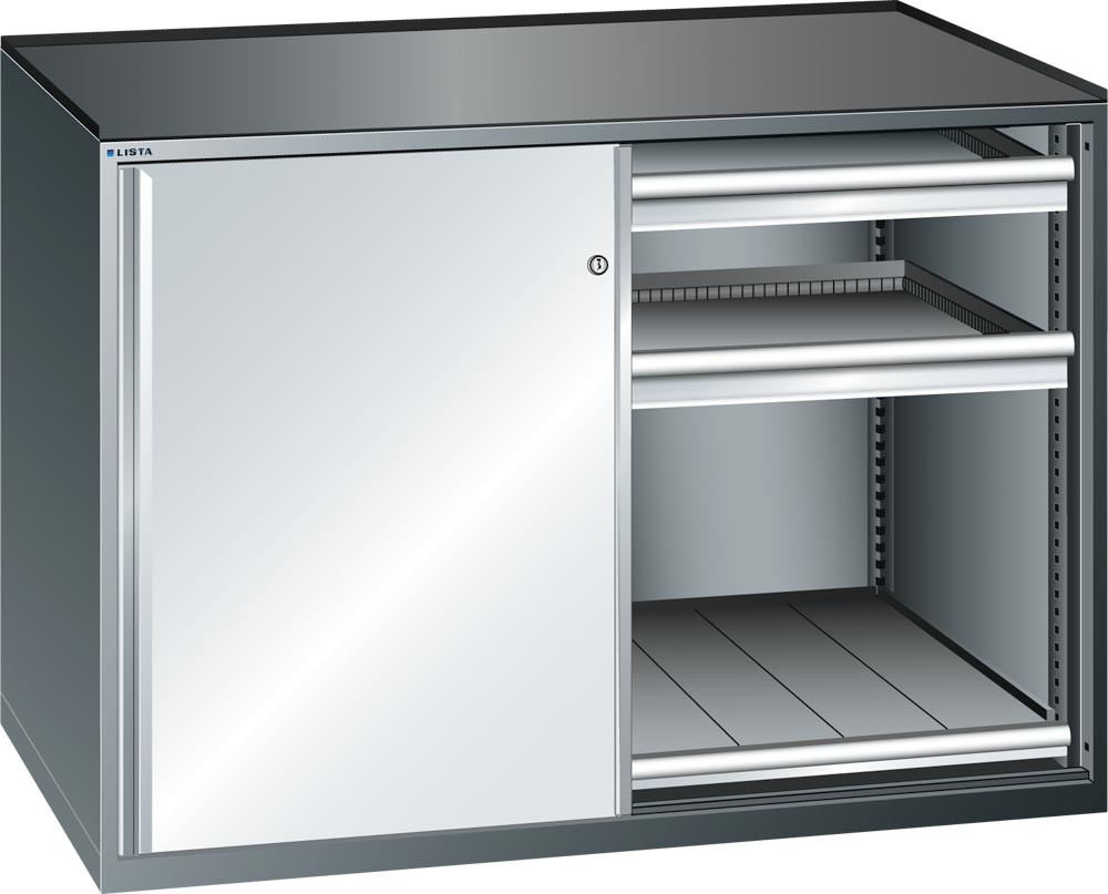 Schubladenschrank m. Schiebetüren, BxTxH 1430x780x1020 mm, 4 Schubladen 75 kg u. 2 Auszüge 75 kg, Schloss, RAL 7035 E1986788