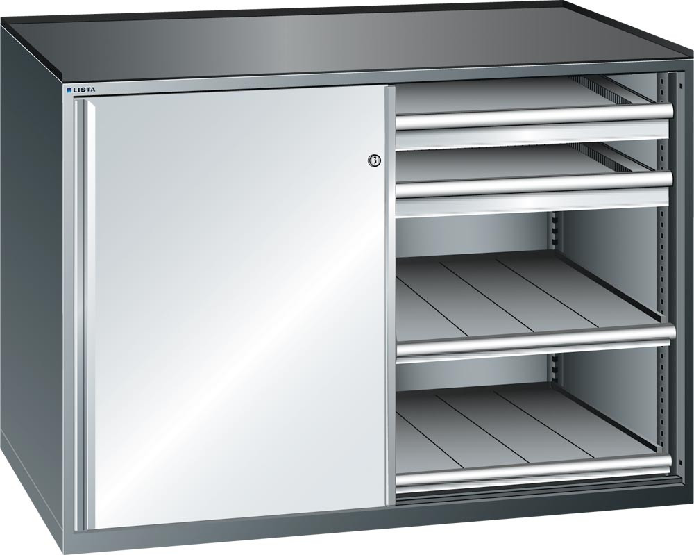 Schubladenschrank m. Schiebetüren, BxTxH 1430x780x1020 mm, 4 Schubladen 75 u. 4 Auszüge 75 kg, Schloss, RAL 7035 E1986796