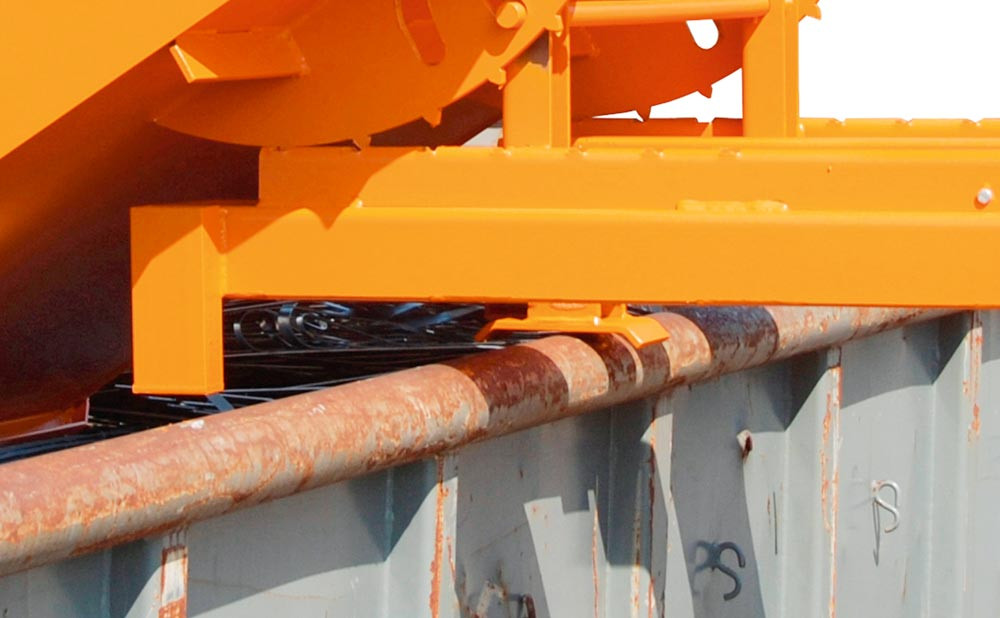 ∙ Mit Abrollsystem ∙ Automatische Entriegelung durch Aufsetzen des Auslösefußes auf Containerrand oder manuelle Entriegelung durch Zugseil ∙ Sicherung gegen unbeabsichtigtes Abrutschen oder Auskippen ∙ Robuste Stahlkonstruktion mit Randverstärkung, 5 mm Wannenblech ∙ Durchgehend geschlossene und 6 mm starke Einfahrtaschen für hohe Stabilität, speziell für schwere Güter ∙ Günstiger Lastschwerpunkt