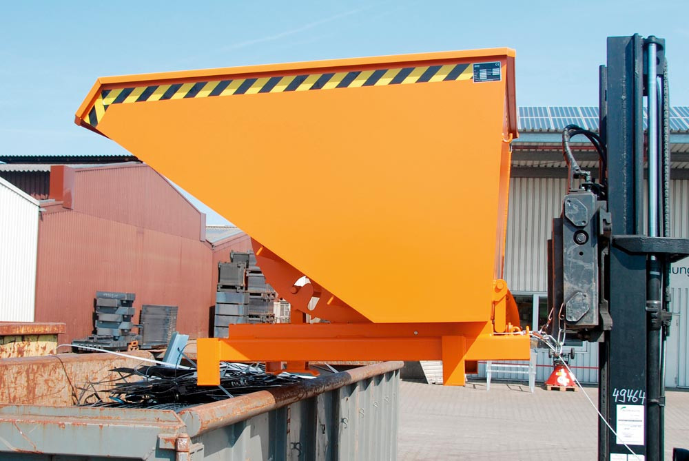 Schwerlastkipper, automatische Entriegelung, LxBxH 1310x1105x970 mm, Volumen 0,6 cbm, Traglast 4000 kg, RAL 2000 gelborange