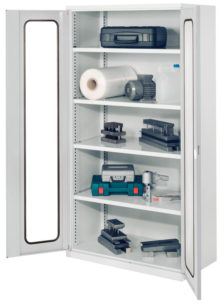 Schwerlastschrank, Sichtfenstertüren, 4 Fachböden, BxTxH 1000x600x1950 mm, RAL 7035