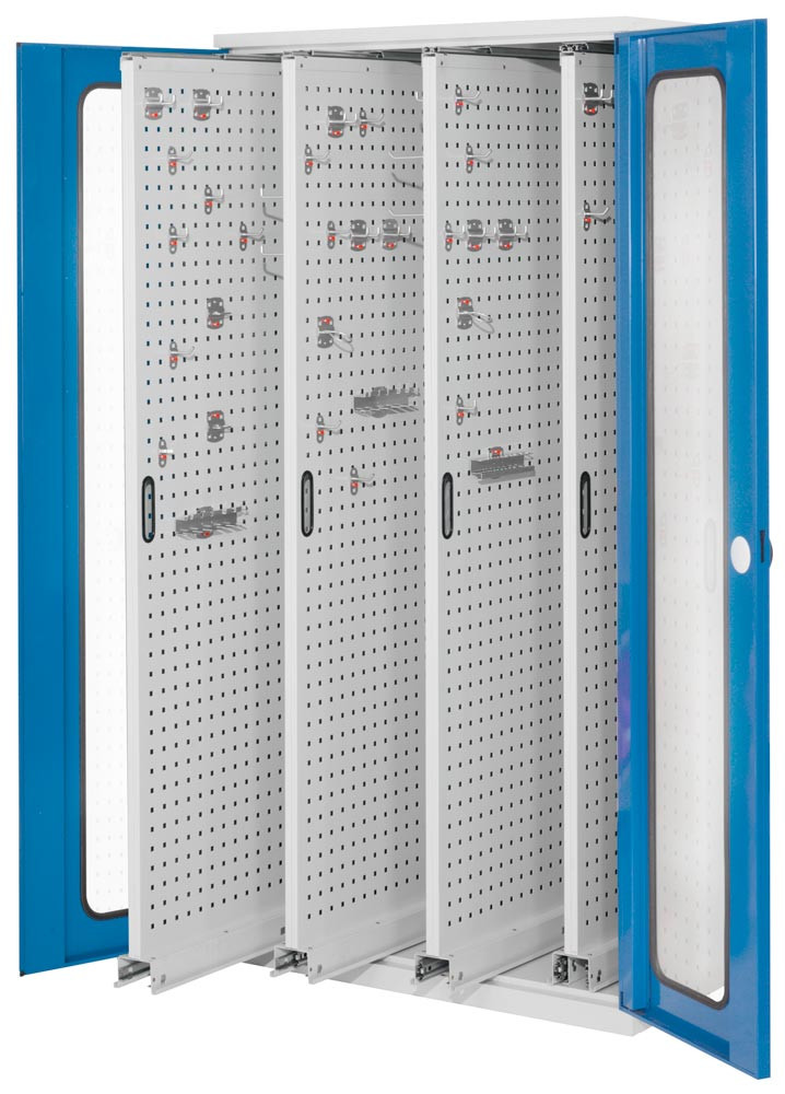Schwerlastschrank, Sichtfenstertüren, 4 Vertikalauszüge BxTxH 1000x600x1950 mm, RAL 7035/5010