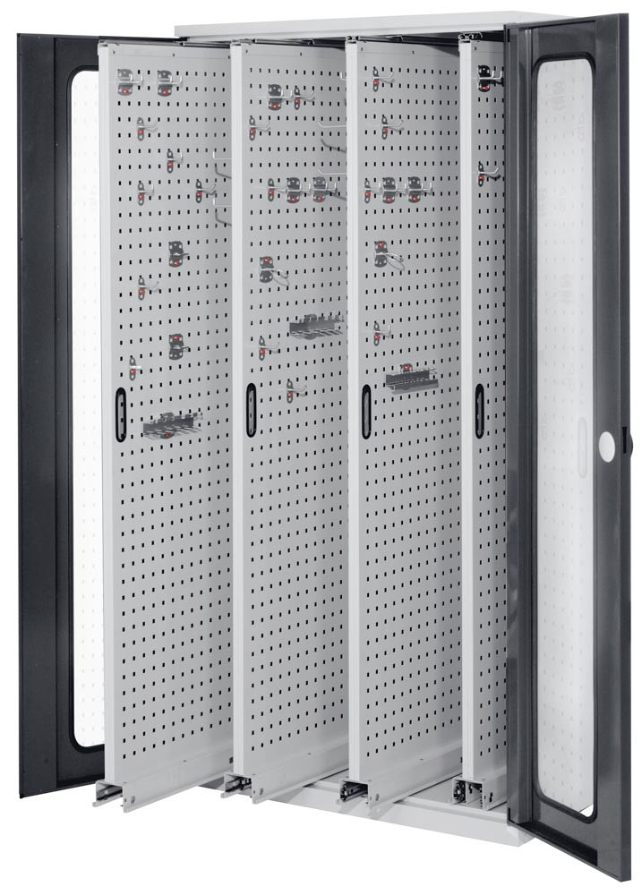 Schwerlastschrank, Sichtfenstertüren, 2 Vertikalauszüge, 3 Fachböden, BxTxH 1000x600x1950 mm, RAL 7035 E863644
