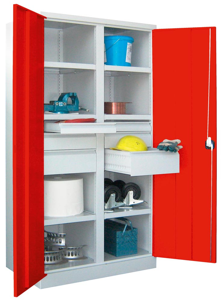 Schwerlastschrank, Vollblechtüren, mit Trennwand, 6 beschichtete Böden, 6 Schubl. 175 mm, BxTxH 1040x630x1950 mm, RAL 5010 E1572917