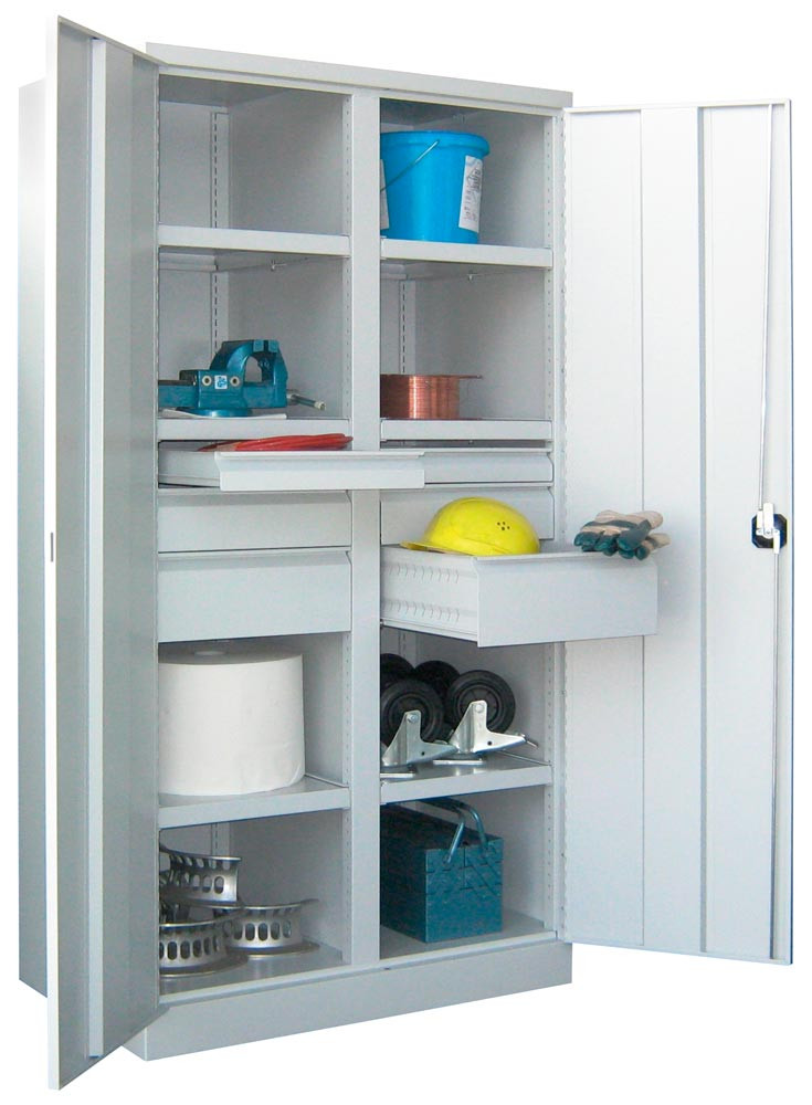 ∙ Besonders stabile, verwindungssteife Stahlblechkonstruktion ∙ Oberfläche pulverbeschichtet ∙ Schränke mit gemeinsam verschließbaren Flügeltüren mit Verstärkungstaschen ∙ Die Türen sind über einen dreiriegeligen Drehgriff mit integriertem Zylinderschloss inkl. 2 Schlüsseln verschließbar ∙ Türöffnung 180 ° ∙ Belastbarkeit je Boden 120 kg bzw. 200 kg, je Schublade 60 kg bei gleichmäßig verteilter Last ∙ Gehäuse-Belastbarkeit 1300 kg ∙ Einrichtungselemente im Raster von