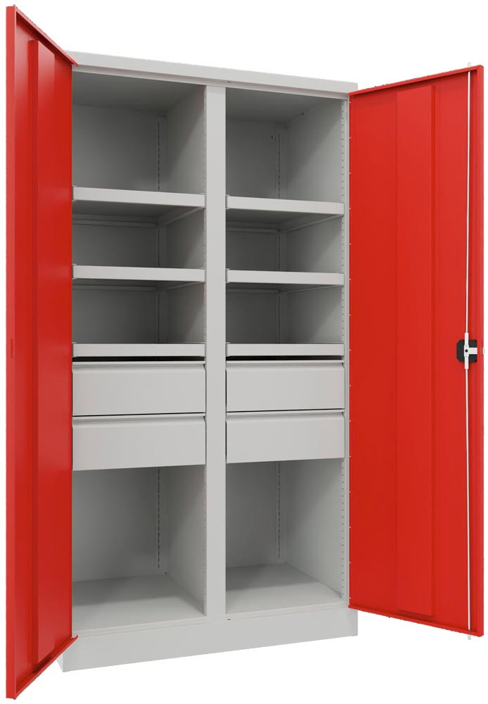 Schwerlastschrank, Vollblechtüren, ohne Trennwand, 3 Böden, 120 kg Traglast, 2 Schubl. 175 mm, BxTxH 1040x630x1950 mm, RAL 7035/3000