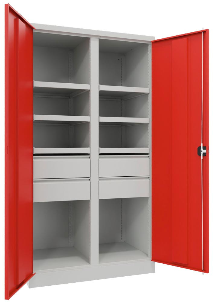 ∙ Besonders stabile, verwindungssteife Stahlblechkonstruktion ∙ Oberfläche pulverbeschichtet ∙ Schränke mit gemeinsam verschließbaren Flügeltüren mit Verstärkungstaschen ∙ Die Türen sind über einen dreiriegeligen Drehgriff mit integriertem Zylinderschloss inkl. 2 Schlüsseln verschließbar ∙ Türöffnung 180 ° ∙ Belastbarkeit je Boden 200 kg, je Schublade 60 kg bei gleichmäßig verteilter Last ∙ Gehäuse-Belastbarkeit 1300 kg ∙ Einrichtungselemente im Raster von