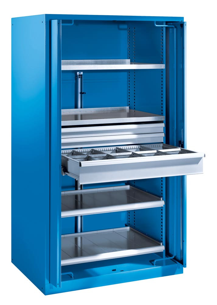 · Hohe Gehäusestabilität durch verschweißte Stahlblechkonstruktion · Eignen sich zur Lagerung von schweren Materialien, Vorrichtungen, Maschinen und Maschinenteilen · 4 Frontvarianten wählbar · Dank Rasterung individuell erweiterbar mit Böden, Schubladen mit Patentrasterung und Auszugböden · Gehäusetragfähigkeit 1500 kg · Traglast: Schubladen 200 kg, Fachböden 160 kg · Schlossvarianten frei wählbar: Klappgriff mit Zylinderschloss und 2 Schlüsseln oder elektronisches Zahlenschloss