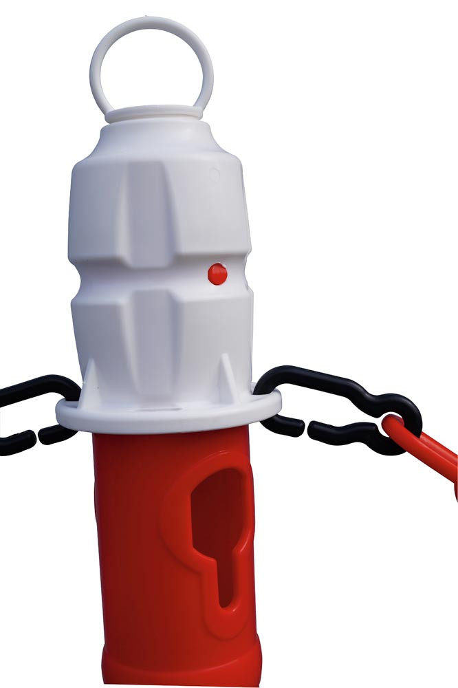 bestehend aus 6 Sperrpfosten (Polypropylencarbonat) · Pfosten rot mit 2 weißen reflektierenden Streifen H 1000 x Ø 63mm · Öse am Pfostenkopf · Sechseckfuß 370 x 75 mm und 5 Ketten (Polypropylen) mit Universalhaken Länge je 3 m