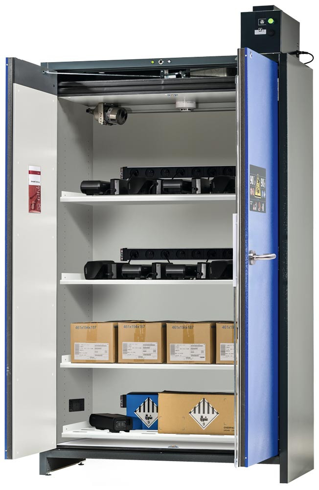 ∙ Aktive und Passive Lagerung von Lithium-Ionen-Akkus in Arbeitsräumen ∙ Stabile Konstruktion mit hochwertiger Pulverbeschichtung, Korpus RAL 7016 anthrazitgrau / Tür RAL 5010 enzianblau ∙ Türen mit permanenter Selbstschließung mittels ölgedämpfter Türschließer ∙ Bodenunebenheiten können durch die Stellfüße ausgeglichen werden · Isolierte Fachböden - Verhindern eine Propagation (Übergreifen von Flammen) zwischen Lagerebenen ∙ Feuerwiderstandsfähigkeit 90 Minuten (von außen nach innen) Typ 90 gemäß EN 14470-1 und 90 Minuten (von innen nach außen) in Anlehnung an EN 1363-1 ∙ Hochwertige Steckdosenleisten ∙ Rauchmelder