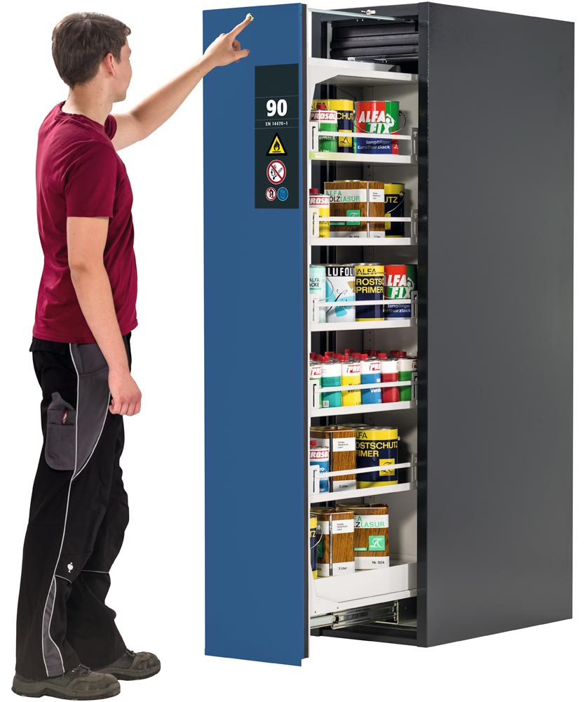 ∙ Direkter Zugriff auf alle eingelagerten Gebinde bei maximaler Übersichtlichkeit ∙ Maximale Sicherheit bei der Gefahrstofflagerung ∙ Perfekte Integration in bestehende Arbeitsabläufe ∙ Optimale Nutzung vorhandener Flächen ∙ Höchste Komfort in der Anwendung ∙ Die elektromotorisch gesteuerten Vertikalauszüge sind bequem in der Bedingung und ermöglichen ein einfaches Arbeiten am Schrank mit Zugriff von beiden Seiten ∙ Eingelagerte Gebinde lassen sich jederzeit einsehen und einfach erreichen