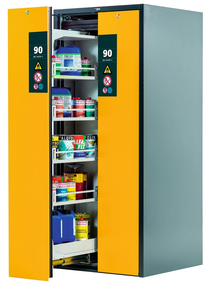 Sicherheitsschrank mit Vertikalauszug, Typ 90, BxTxH 450x860x1966 mm, 4xFachboden, 1xLochblecheinsatz, 1 Bodenwanne, RAL 7016/1004 E6020905