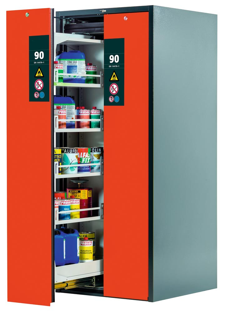 Sicherheitsschrank mit Vertikalauszug, Typ 90, BxTxH 819x860x1966 mm, 8xFachboden, 2xLochblecheinsatz, 2 Bodenwannen, RAL 7016/3020