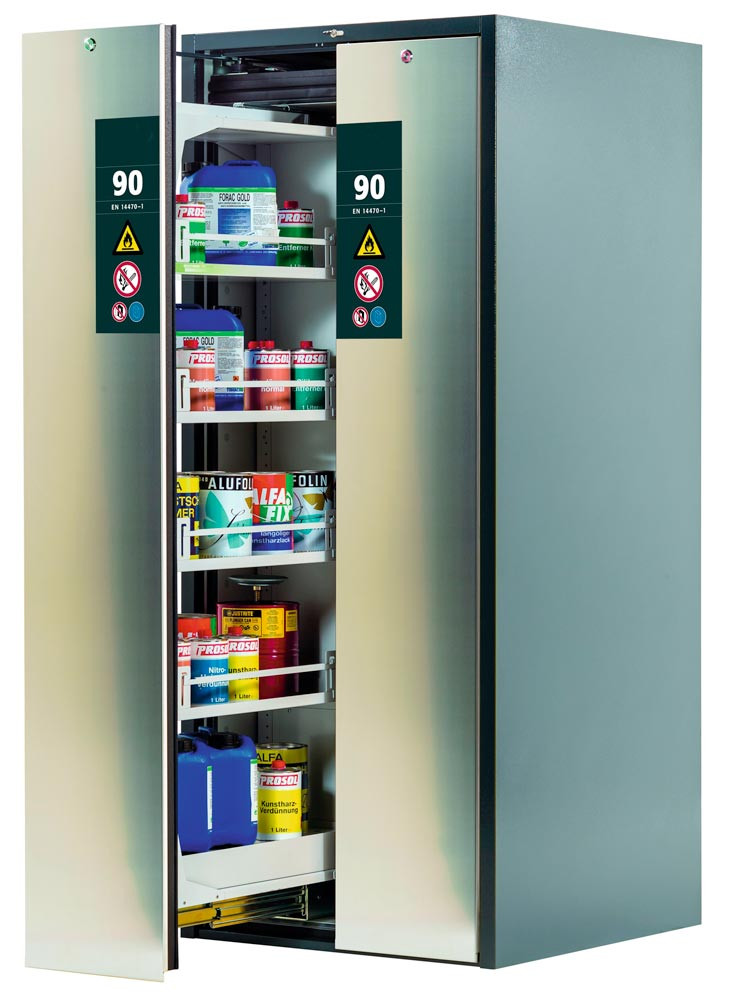 Sicherheitsschrank mit Vertikalauszug, Typ 90, BxTxH 819x860x1966 mm, 8xFachboden, 2xLochblecheinsatz, 2 Bodenwannen, RAL 7016/Edelstahl
