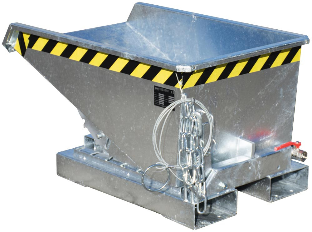 · Robuste Stahlblechkonstruktion, 3 mm Wannenblech mit umlaufend Randprofil · Siebblech und Ablasshahn 1" zum Trennen der Flüssigkeiten von Feststoffen · Öl- und wasserdicht · Günstiger Lastschwerpunkt · Kippen in jeder Höhe per Seilzug vom Staplersitz aus · Nach erfolgter Entleerung schwenkt der Behälter selbstständig in die Ladestellung zurück · Stabiler Grundrahmen mit Einfahrtaschen · Sicherung gegen Abrutschen und unbeabsichtigtes Auskippen