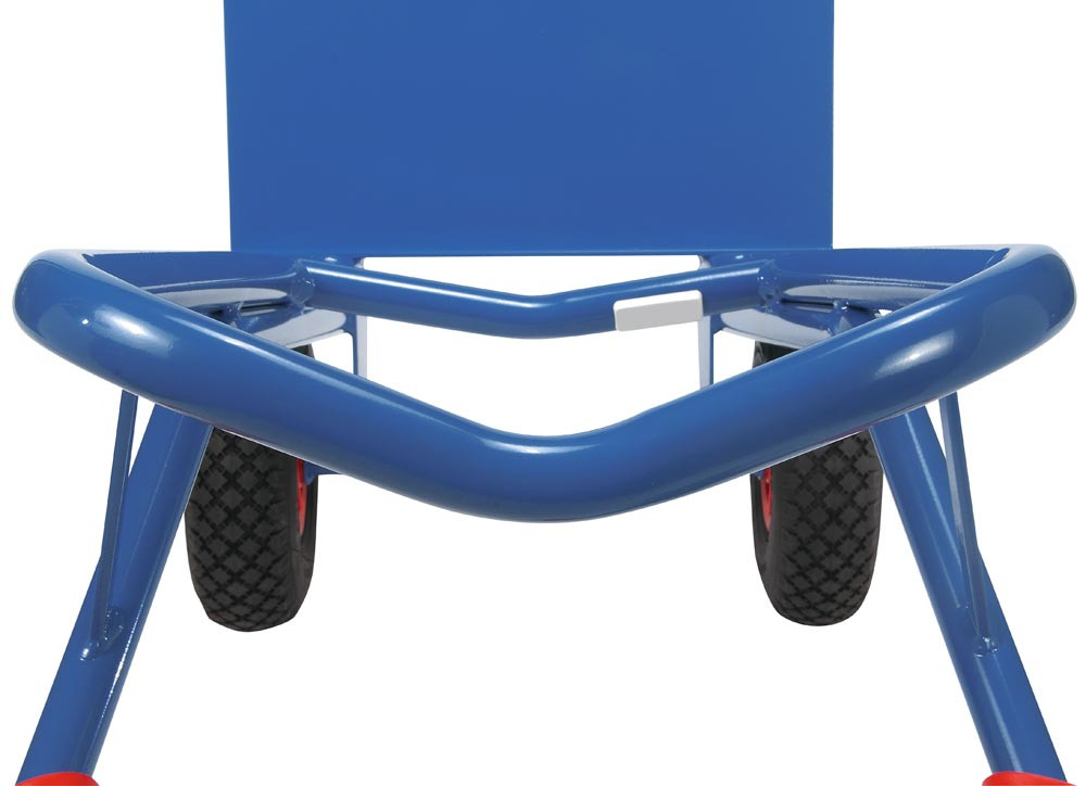 ∙ Stabile Schweißkonstruktion ∙ Schlag- und kratzfeste Pulverbeschichtung in RAL 5007 · Bügel oben und Querstreben durchgebogen - für den sicheren Transport von Gütern wie Rollen, Kannen, Eimern usw. · Stahlblechschaufel anschraubbar und dadurch austauschbar (Lieferung unmontiert) ∙ Sicherheitsgriffe ∙ Mit Luftbereifung 260 x 85 mm auf Kunststoff-Felge ∙ Naben mit Rollenlagern