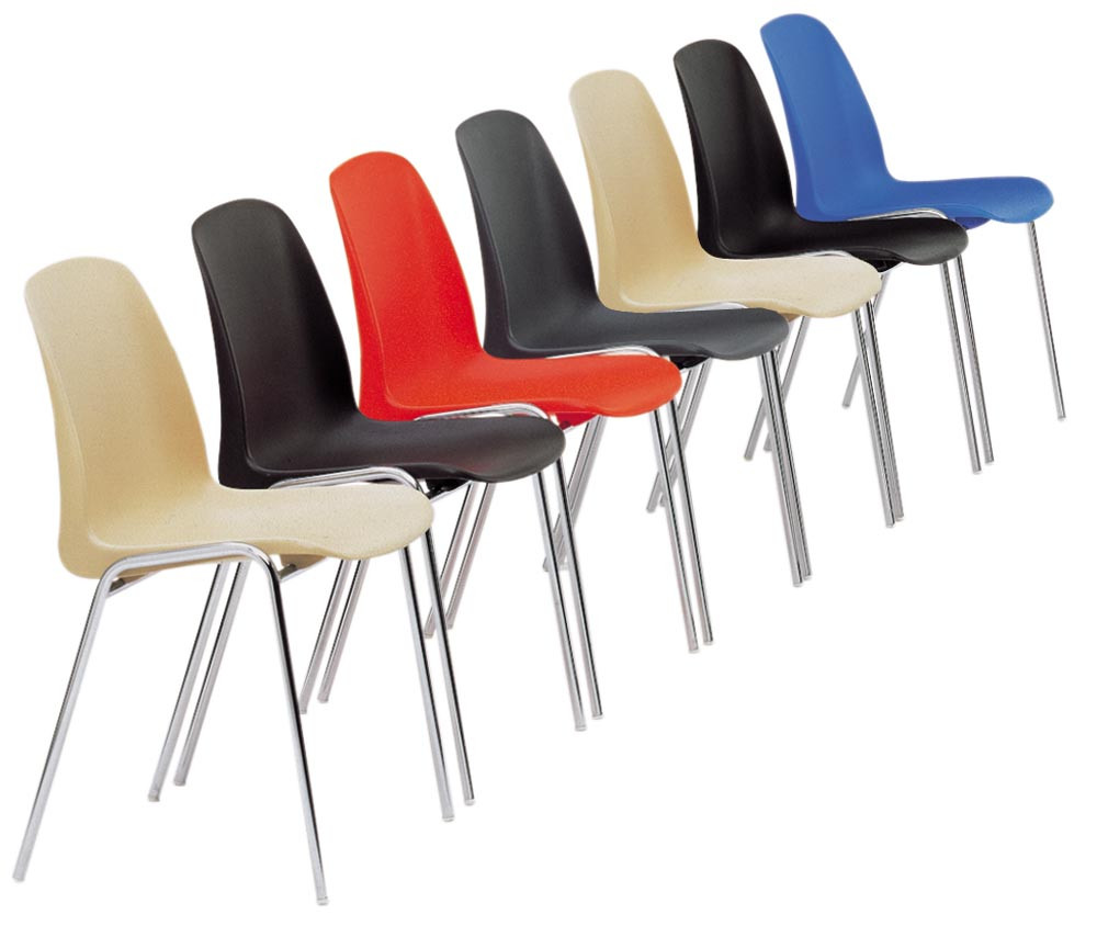 ∙ In vielen Farben, strapazierfähig und pflegeleicht ohne Sitz- und Rückenpolster ∙ Ohne Armlehnen ∙ Stapelbar ∙ Verchromtes Rundrohrgestell, Ø 18 mm, Materialstärke 1,5 mm ∙ Sitzschalen aus Kunststoff