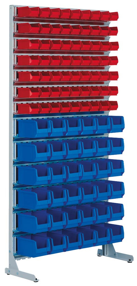 ∙ Teilelager für rationelle Materialstellung in Fertigung und Montage ∙ Ideal für den Einsatz direkt am Arbeitsplatz · Hohes Lagervolumen auf engstem Raum ∙ Einfaches Verstellen der Aufhängeschienen zur flexiblen Änderung der Kastenbestückung · Unterschiedliche Kastengrößen auf mehreren Ebenen · Hochwertige Pulverbeschichtung in RAL 7035 lichtgrau · Aufhängeleisten verzinkt