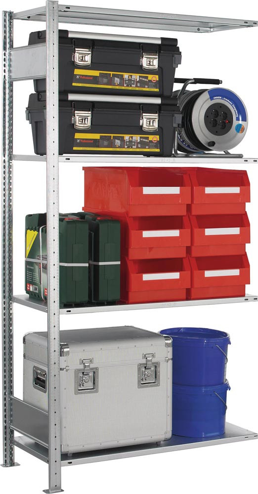 Steckregal, Anbaufeld, verzinkt, 4 Fachböden, Fachlast 150 kg, BxTxH 1000x400x2000 mm