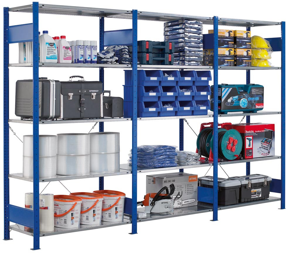 Steckregal, RAL 5010 enzianblau, Anbaufeld, 5 verzinkte Fachböden, BxTxH 750x300x2000 mm, Fachlast 150 kg E1992011