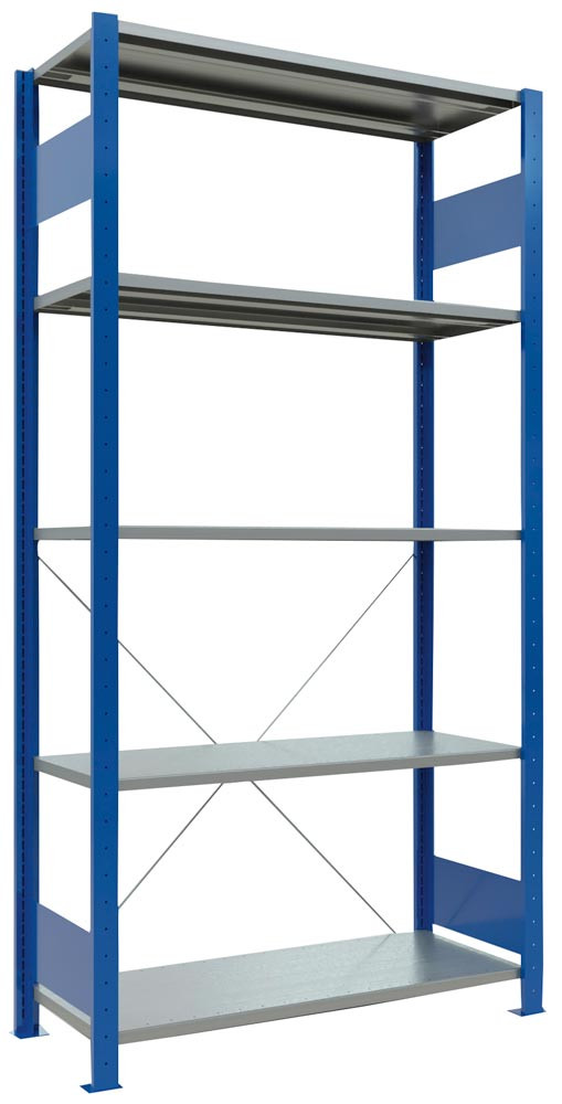 Steckregal, RAL 5010 enzianblau, Anbaufeld, 5 verzinkte Fachböden, BxTxH 1000x300x2000 mm, Fachlast 250 kg E1992121